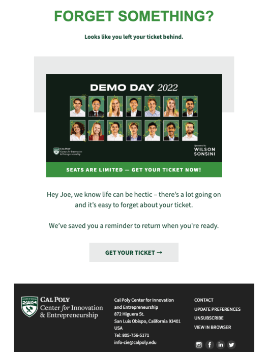 I wanted to convert subscribers who went to our event page but did not register for the event. Unfortunately, our software did not support abandoned cart automations, so I created a workaround that I call abandoned “click.”
